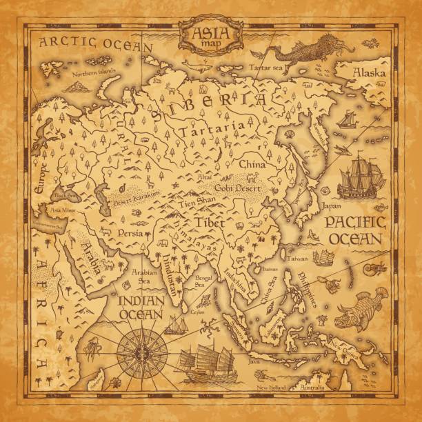 Vintage map of Asia, vector ancient parchment with asian continent with mountain ranges, rivers and lakes names, ocean wind rose, mythological sea beasts, ship, medieval territory on aged old paper